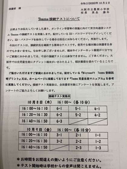 本日、子ども達に『Teams接続テストについて』というお手紙を