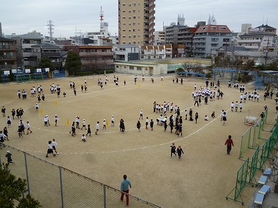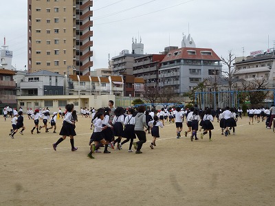 1限後の10分間の休み時間に運動場に出てきて、トラックの内側を低学年、トラックを中学年、トラックの外側を高学年が、準備運動の後、それぞれのペースで走ります。