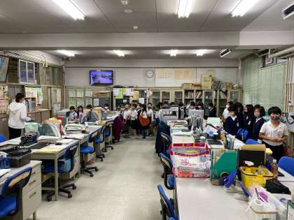 (写真は職員室を紹介するために探検しているところです。)