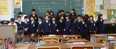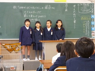 学級でも歌の練習をしており、今日、2年生では4〜5人のグループで発表会をしていました。おおきな、きれいな声で、歌詞も覚えて歌ってくれていました。