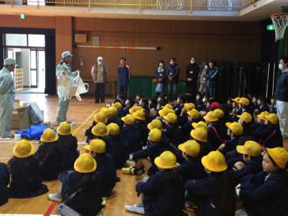 中学年は講堂で、本校に備蓄している物品を実際に見たり、体験をしました。