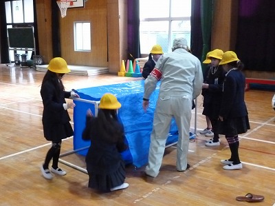 実際に簡易トイレを組み立ててみたり、担架で人を運んだりもしました。