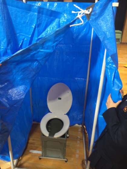 非常用の水、ご飯、カンパン、毛布、担架、救急品、手回し発電機付の懐中電灯、簡易トイレ、バール、ハンマーなどがありました。