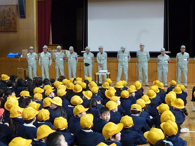 避難訓練の後、講堂に入り、まずは、今日の学習の様々な場面でお世話になる豊新地域の防災リーダーさんたちの紹介がありました。