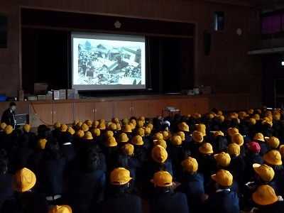 そして、20年前の今日、1月17日に発生した阪神・淡路大震災時のスライドを見ました。街の悲惨な状況に子どもたちも目を疑っていました。