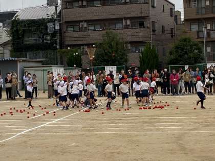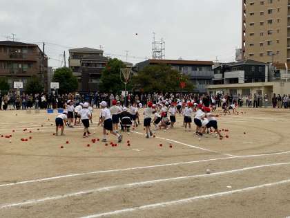 曲に合わせてダンス、そして玉入れです!2組が勝ちました。