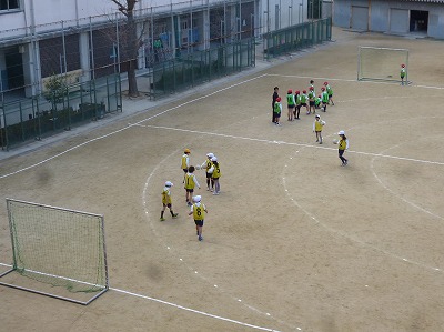 今日は運動場にコートが作られ、ミニゴールも設置されました。