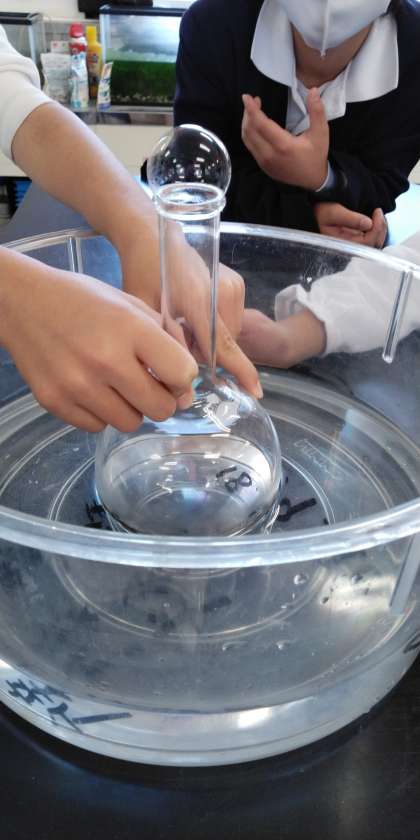 理科室での初めての実験です。とじこめた空気をあたためるとどうなるでしょうか。みんな興味津々です。
