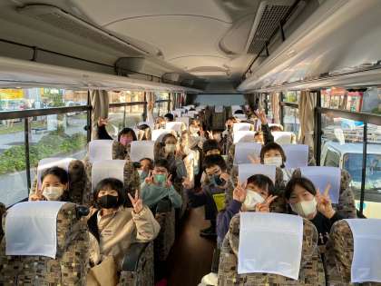 静かに楽しく小声で歌いながら・・・。バスは吹田市内から新御堂、千里へ向かっています。