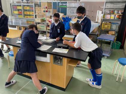 グループに分かれて実験中。それぞれ役割を決めて学習しています。林間学習で学んだ仲間との協働の学びが生かされる場面です。