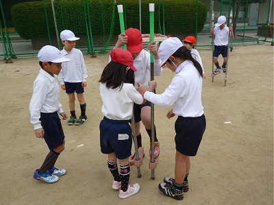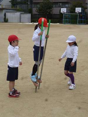 1年生が体育の時間に竹馬にチャレンジしていました。