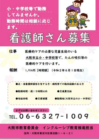 大阪市の小学校や中学校には、たんの吸引や胃ろう、導尿等、医療的ケアを必要とする子どもたちが多く学んでおり、安心・安全な学校生活を送るためには、看護師さんのサポートが必要です。