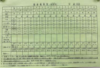 本日、新しい健康観察表(1/9〜2/5)を子ども達に配付しました。緑色の用紙(両面)です。