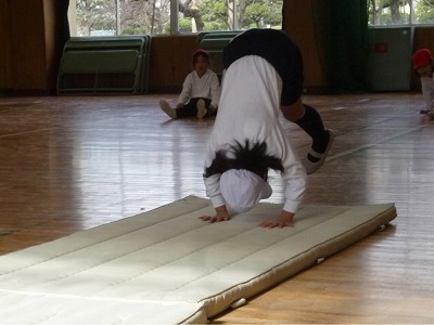 まだ、頭のてっぺんをマットにつけてまわる子もいましたが、多くの子どもたちは、しっかりとおへそを見て、上手に回っていました。