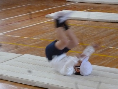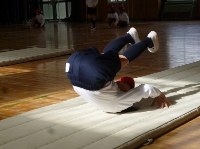 先生の説明を聞いて、順番にマット上で、2回連続しての前まわりです。