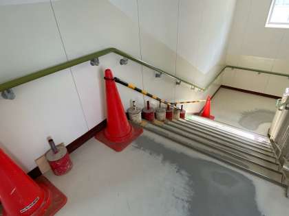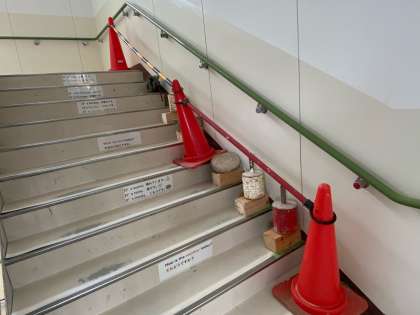 現在、5年生が主に使っている階段のステップがめくれてきたので、管理作業員さんに直してもらっています。