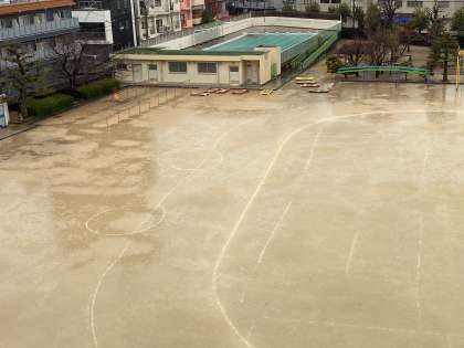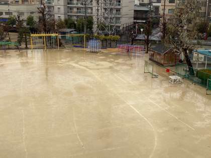 この季節に二日続けて雨なんて・・・。運動場もごらんの通りです。