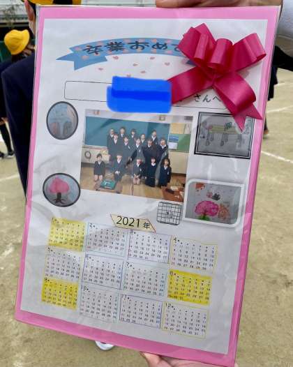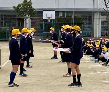 コロナ禍で学校のリーダーとして率先して活動してきた6年生に在校生からのプレゼントを渡しました。