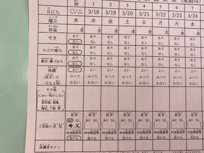 写真にありますように、新しい健康観察表(ピンク色)を配付しました。3/18から春休み中も必ず実施します。