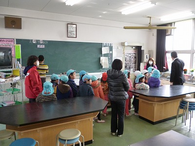 1年生の教室の様子、講堂での1年生の体育の授業の様子、理科室や図工室などの特別教室などを見学し、授業をしている学級前の廊下を通って、小学校の雰囲気を感じてもらいました。