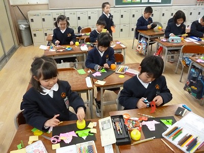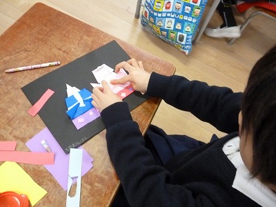 そこに、色画用紙でまわりの飾りをはさみで切って、のり付けしていました。