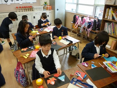 このクラスでは、折り紙と色画用紙を使って、おひな様の飾りを作っていました。