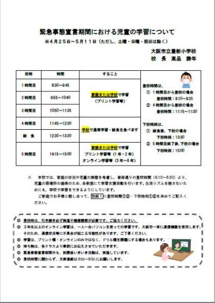 再度お願いします。本日、児童に配布している「緊急事態宣言期間における児童の学習について」です。通常の時程とは異なりますので、必ず確認をお願いします。