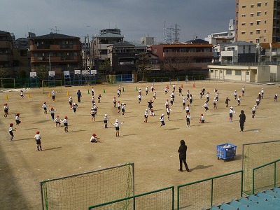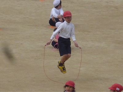 朝からのくもり空で、気温も低い中ですが、元気よく運動場でなわとび練習です。