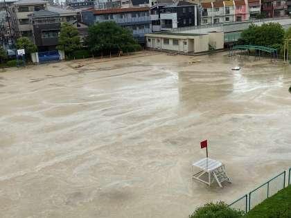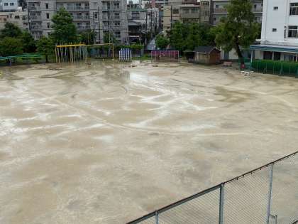 ご覧のように運動場が使えません。休み時間、ろう下の窓から運動場をながめる子ども達もいます。