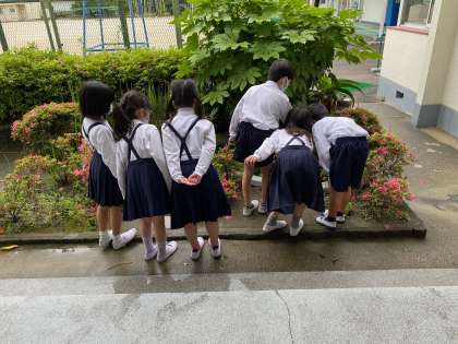 職員室の前の池をのぞくお友だち。