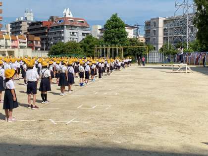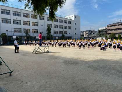 梅雨の中休み、綺麗な青空の下で児童朝会ができました。