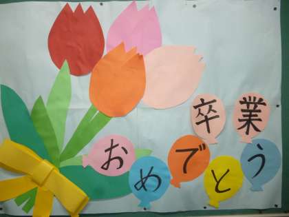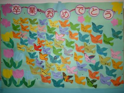 2号階段1階の掲示板の飾りには、鳩の中に卒業生の名前が書かれていました。