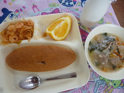 今日は中華料理でした。エビのチリソース炒めは、小エビがたくさん入っていました。ケチャップに豆板醤が入っていて、ほんの少しピリ辛で、おいしくいただきました。