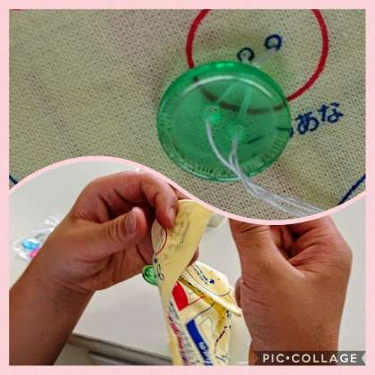 先ずは菜箸・リボン・厚紙で作ったでかでか針・糸・ボタンで作業の流れを確認します。