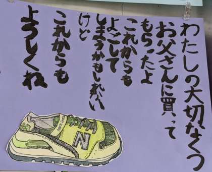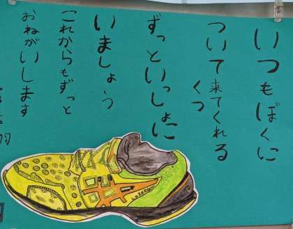 しわや汚れなどを注意深く見ながら、自分の靴を描き、色をつけました。