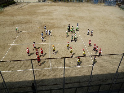 目の前の敵を見ていても、横からボールで狙われたりと、かなり難しいようですが、また、それが子どもたちのテンションを高めていました。