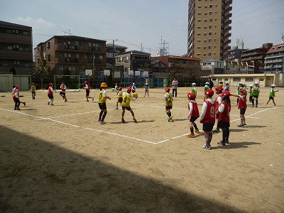 クラスで赤・黄・緑・青の4チームつくり、それぞれのエリアに内野が入り、ボールも2個使ってのドッジボールです。