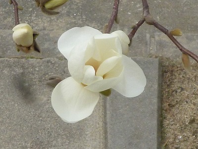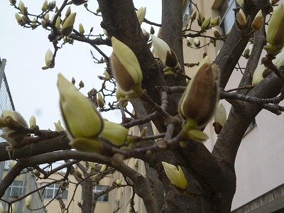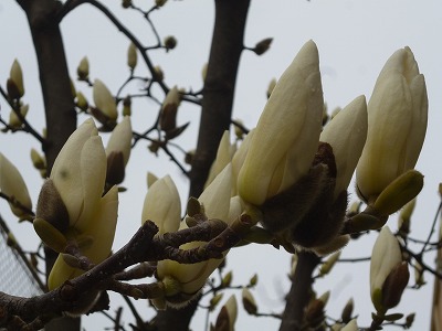 今週の暖かい陽気に連れられて、なかよし教室前のハクモクレンが、つぼみについていたわたぼうしを脱ぎ去り、真っ白なつぼみが顔を出し、急激に大きくなりました。