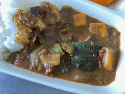 ナスやピーマン、トマトなどの夏野菜がたっぷり入っています。かぼちゃの甘味もルーに入っています。