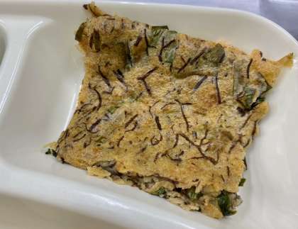 今日の『ヒラヤーチー』は、小麦粉、卵、もずく、ニラを混ぜ合わせてうすく延ばして焼いています!