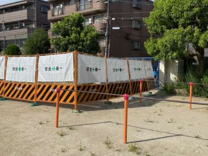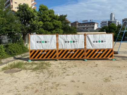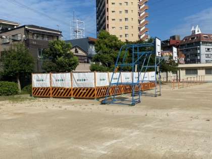 校内の設備工事のために、写真にありますように、運動場西門付近に工事車両用のフェンスを設置しました。