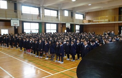 講堂にて、2年生から6年生が集まり、平成27年度着任式・1学期始業式を行いました。(1年生は教室で担任の先生と学級活動です)