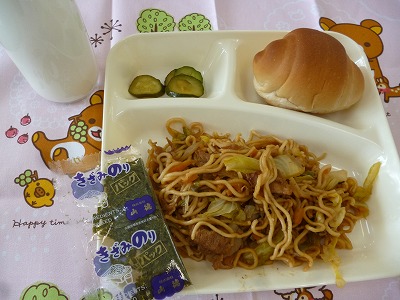 焼きそばは子どもたちにも好評で、クラスには依然された焼きそばは全部残さずに食べてくれました。豚肉、イカもたっぷり入っていて、中にはパンにはさんで焼きそばパンとしておいしそうに食べている子もいました。