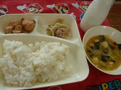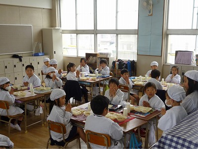 また、2年生の子どもたちと今日のおみそ汁の具を調べました。みんなの協力で、わかめ、たまねぎ、ごぼう、ニンジン、えのきたけ、豆腐、白菜の7種類と答えが出ました。(あとで、職員室で調べたら、白菜ではなくで、キャベツでした)