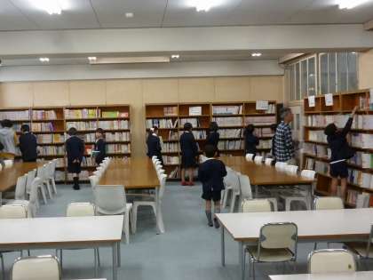 図書室にはたくさん本があります。読んだ後の本がていねいに元の場所に帰っていないと、次に探すときに大変です。今日は、違う場所に行った本や、ひっくり返っている本などの整理を行っていました。