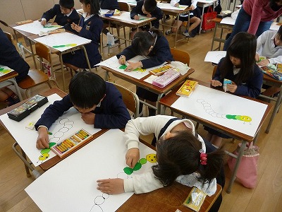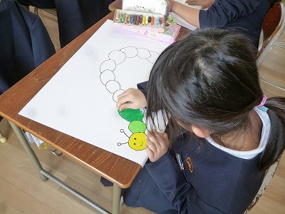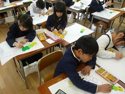 2年生は図工の時間に、「カラフルあおむしくん」いう題材に取り組んでいます。