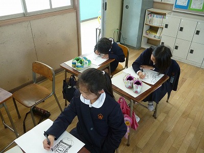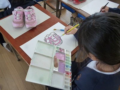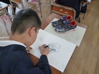 図工の時間に「私のくつ」というテーマで、自分の履いている靴を目の前に置き、スケッチをしていました。