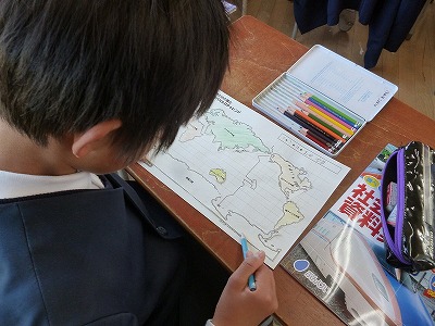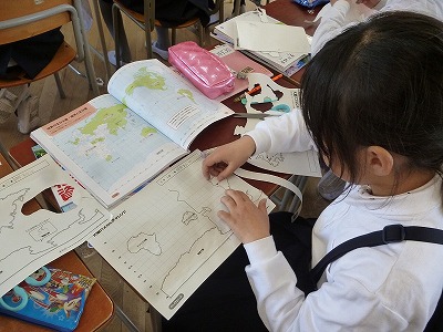世界の主な大陸の位置や日本の位置を確認するために、「大陸パズル」を行っていました。