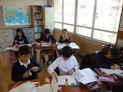 シートに印刷されたユーラシア大陸、北アメリカ大陸などの大陸と日本をはさみで切り取り、緯度と経度のみが記された世界史図に、地図帳を参考に見て、正確な位置に貼っていきました。