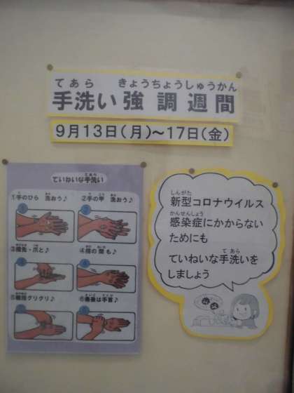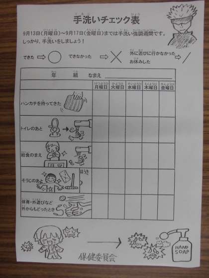 チェック表のイラストは保健委員会の5・6年生が描きました。しっかり手洗いをして、チェック表をつけましょう。